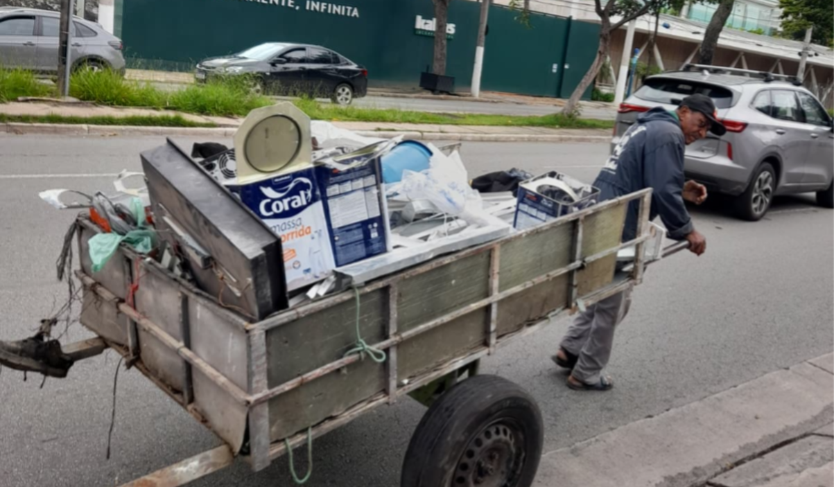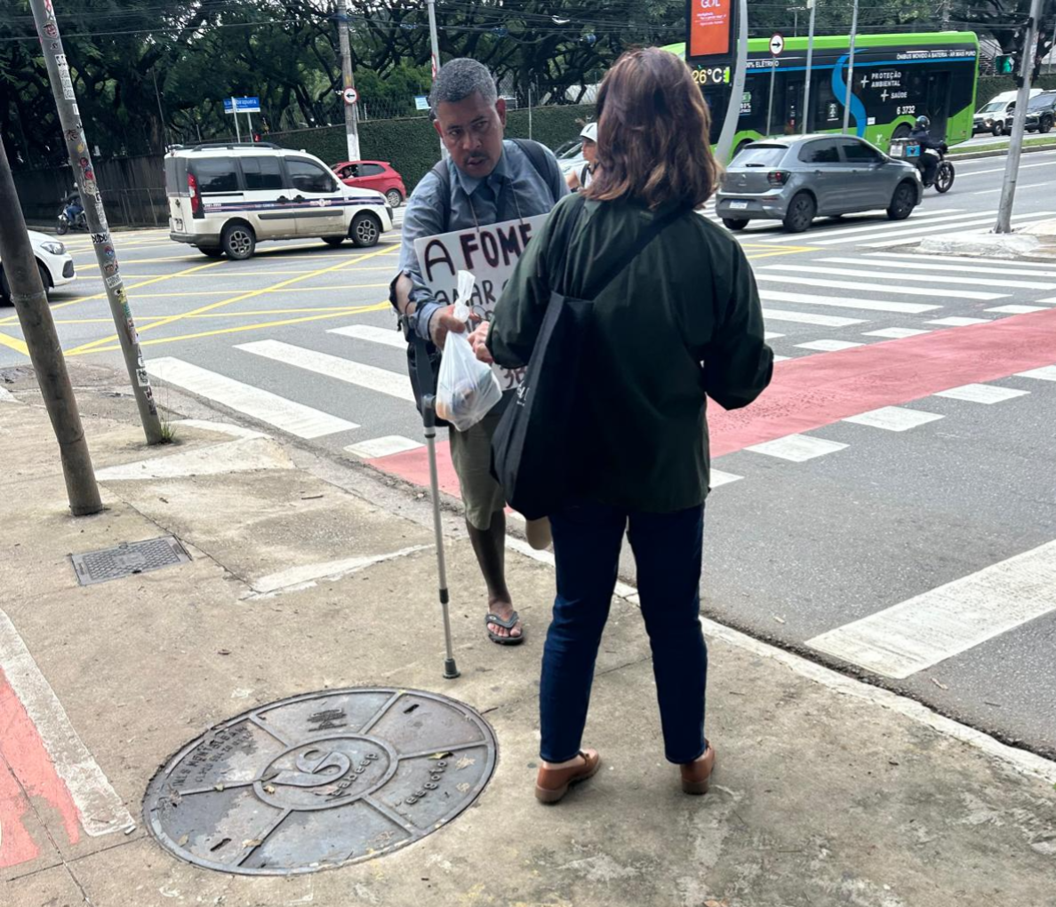 Snackpakketten uitdelen aan mensen die op straat leven en onderbetaalde arbeiders. De onderste foto laat een man zien die afval ophaalt, een zware kar met zich mee zeult in de hoop aan het einde van de dag wat geld te krijgen voor zijn lading afval. Armoede genoeg in São Paulo. Stichting Het Pad in actie!
